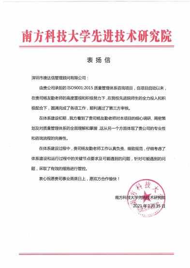 近日,在深圳康達(dá)信管理顧問(wèn)有限公司ISO9001項(xiàng)目楊友勤老師的專(zhuān)業(yè)及細(xì)心指導(dǎo)下,雙方經(jīng)過(guò)3個(gè)月努力,南方科技大學(xué)