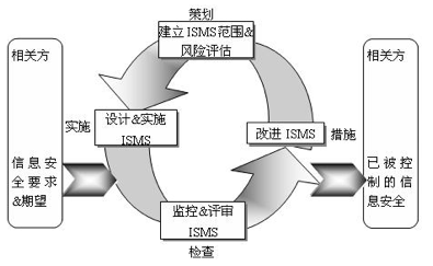 BS7799(ISO27001)標(biāo)準(zhǔn)要求基于 PDCA 管理模型來建立和維護(hù)信息安全管理體系(ISMS)。BS7799-2:2002 標(biāo)準(zhǔn)中,明確指出 ISMS 系統(tǒng)一定要符合 PDCA「規(guī)劃—實(shí)施—審核—行動(dòng)(Plan–Do--Check--Action)」的循環(huán),透過這樣的方式運(yùn)行,以達(dá)到信息安全管理控制的目的。為了實(shí)現(xiàn) ISMS,組織應(yīng)該在計(jì)劃(Plan)階段通過風(fēng)險(xiǎn)評(píng)估來了解安全需求,然后根據(jù)需求設(shè)計(jì)解決方案;在實(shí)施(Do)階段將解決方案付諸實(shí)現(xiàn);解決方案是否有效?是否有新的變化?應(yīng)該在檢查(Check)階段予以監(jiān)視和審查;一旦發(fā)現(xiàn)問題,需要在措施(Act)階段予以解決,以便改進(jìn) ISMS。通過這樣的過程周期,組織就能將確切的信息安全需求和期望轉(zhuǎn)化為可管理的信息安全體系。